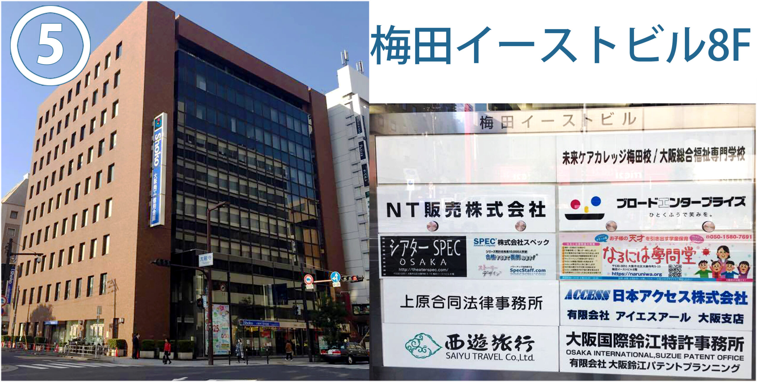 アクセス なるには學問堂へのアクセス 住所 〒530-0051大阪市北区太融寺町5-15梅田イーストビル 7階8階(総合受付8階) 地図 大きな地図 JR 大阪駅または地下鉄梅田駅からの道順 駅から徒歩10分です。 梅田イーストビルに入っていただき、エレベーターで8階までお越しください。